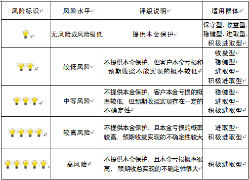 本产品为非保本浮动收益型理财产品,不保证本金和收益,请您充分认识投资风险,谨慎投资。本期产品期限为117天(中国建设银行有权对产品进行展期或提前终止),存续期内,产品不接受申购或赎回申请。本期产品内部风险评级级别为二盏警示灯 ,风险水平属于较低风险。最不利情况下,您将损失全部收益甚至包括全部本金。本理财产品适用于收益型、稳健型、进取型 、积极进取型客户。