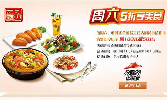 20151172016131日期间每周六,必胜客全国指定门店刷龙卡信用卡消费即享单笔满100元减50元(每客户每活动日最高可减50元)