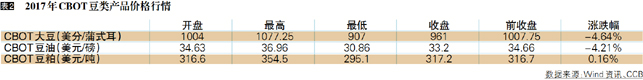 2017年,美豆冲高后大幅下挫,开于1004美分/蒲式耳,收于961美分/蒲式耳,全年跌幅4.63%。前2月美豆震荡上涨,3至6月震荡下挫,跌至900美分/蒲式耳后筑底,顽强守住900美分/蒲式耳关口,7至9月反弹未果,最高冲至1047美分/蒲式耳后一路下探,四季度延续震荡行情。按月来看,7月录得最大月度涨幅5.47%,3月录得最大月度跌幅8.76%。(图5、表2)