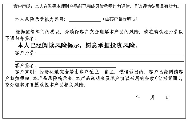 高资产净值客户请在下面填写您的风险承受能力评级、抄录风险揭示语句并签字: