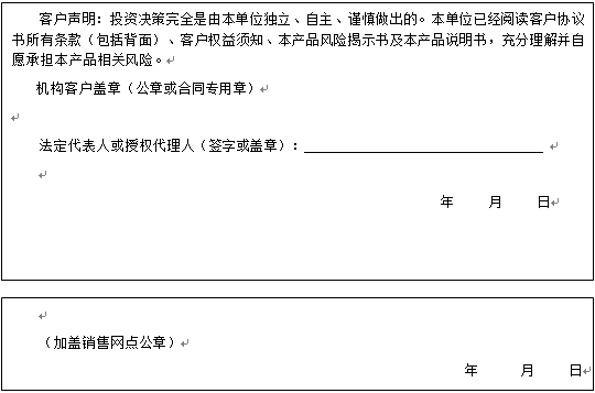 客户签名: ( 客户声明:投资决策完全是由客户独立、自主、谨慎做出的。客户已经阅读客户协议书所有条款(包括背面)、客户权益须知、本产品风险揭示书及本产品说明书,充分理解并自愿承担本产品相关风险。)