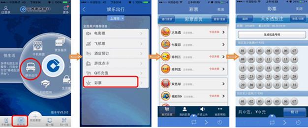 ü 彩票投注 点击页面左下方“悦生活”à选择“娱乐出行”à点击进入“彩票”