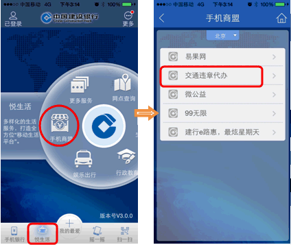 ü 交通罚单查询缴交 点击页面左下方“悦生活”à选择“手机商盟”à点击进入“交通违章代办”