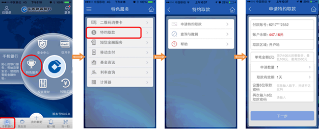 点击页面左下角“手机银行”à选择“特色服务”à点击进入“特约取款”