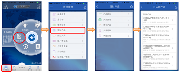 点击页面左下方“手机银行”à选择“理财产品”à选择“投资理财”