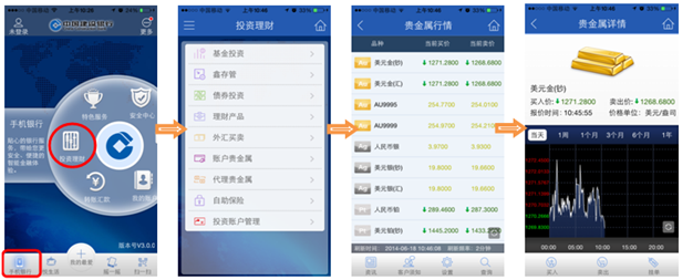 点击页面左下方“手机银行”à选择“理财产品”à选择“账户贵金属”