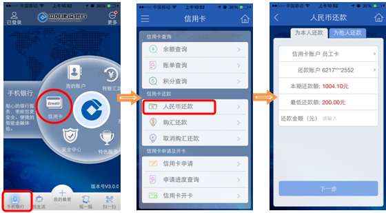点击页面左下方“手机银行”à选择“信用卡”à选择“人民币还款”
