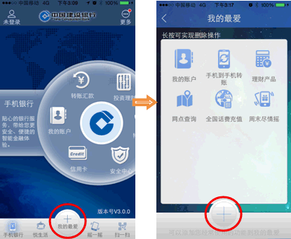 点击页面下方“我的最爱”à点击“+”号增加常用功能或长按已有功能进行删除