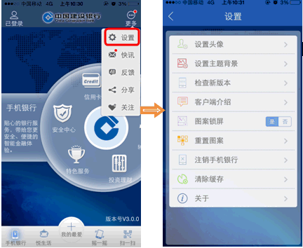 点击页面右上角“更多”à进入“设置”à可设置手机银行头像、主题背景及锁屏图案: