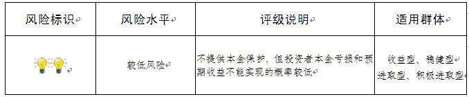 本期产品为非保本浮动收益型理财产品,不保证本金和收益,请您充分认识投资风险,谨慎投资。本期产品期限153天(中国建设银行有权对本期产品进行展期和提前终止),存续期内产品不接受申购或赎回申请。本期产品内部风险评级级别为2盏警示灯 ,风险程度属于较低风险。最不利情况下,资产组合无法回收任何本金和净收益,客户将损失全部本金。产品适合于收益型、稳健型、进取型、积极进取型客户。